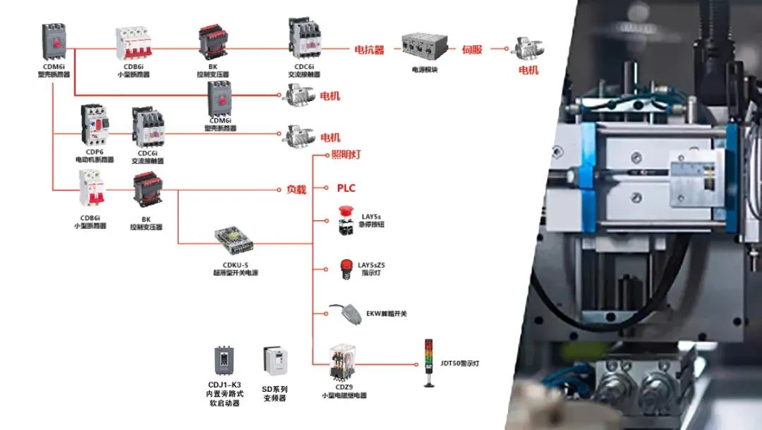 在机床行业控制系统中,德力西电气提供全方面的配套解决方案。以CDC6i系列交流接触器、BK系列控制变压器、CDM6i系列塑料外壳式断路器、SD6系列变频器、CDJ1-K3系列内置旁路式软起动器、开关按钮、指示灯、警示灯等性能稳定、品质卓越的产品助力数控机床发展。同时,德力西电气也在不断超越自我,创新研发新产品,敏捷部署服务,满足技术创新发展需求,与机床行业同步发展。