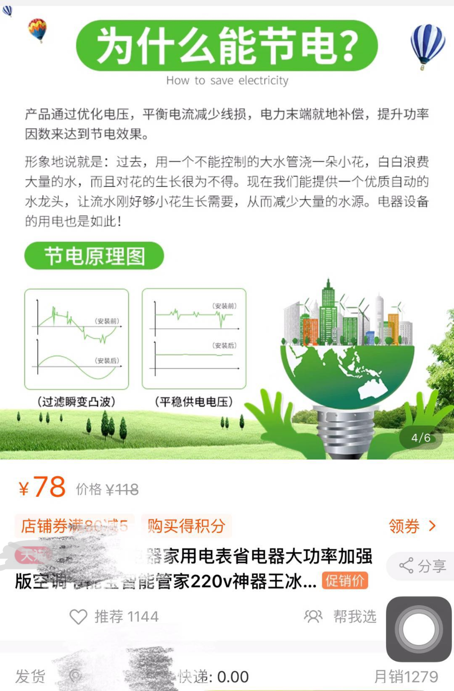 头条君在某购物网站,随手选一款月销量过千的节电神器,发现页面详情中,“为什么能节电”有模有样,似乎很专业……