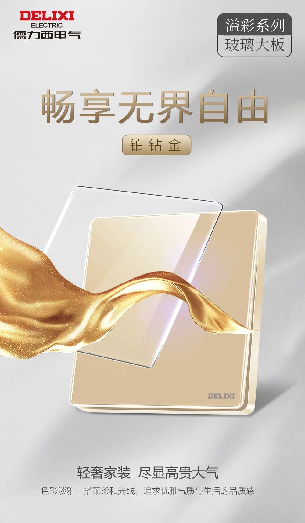 建筑流光溢彩的惊艳视觉享受,在溢彩系列上充分体现。瓷感白、星空灰、钻雕蓝、幻夜黑、铂钻金、开门红等六色,在玻璃面板的映衬下晶莹通透、奢华夺目,极具艺术张力。当简约大气的开关装点家中,任由家居空间风格变化,都能从容掌控,尽显大气格调。