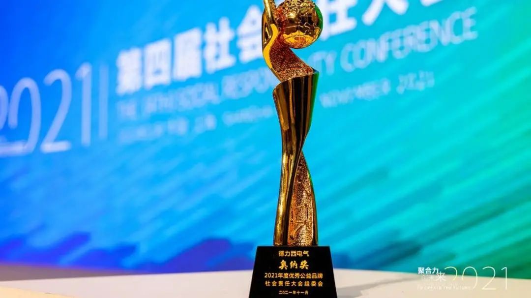 2021年第四届社会责任大会于11月29日在上海圆满落幕,大会以“聚合力,创未来”为主题,通过嘉宾的跨领域交流,探讨疫情后的新时代格局,社会各界如何通过聚集社会合力,更好地驱动社会责任事业的落实,找到社会责任与公益慈善事业创新与发展的突破口。德力西电气受邀参与本次大会并荣获奥纳奖-2021年度优秀公益品牌、奥纳奖-2021年度最具领导力人物及优秀公益纪实短片三大重磅奖项。德力西电气首席文化官胡晓春女士作为代表出席,并在现场接受颁奖。