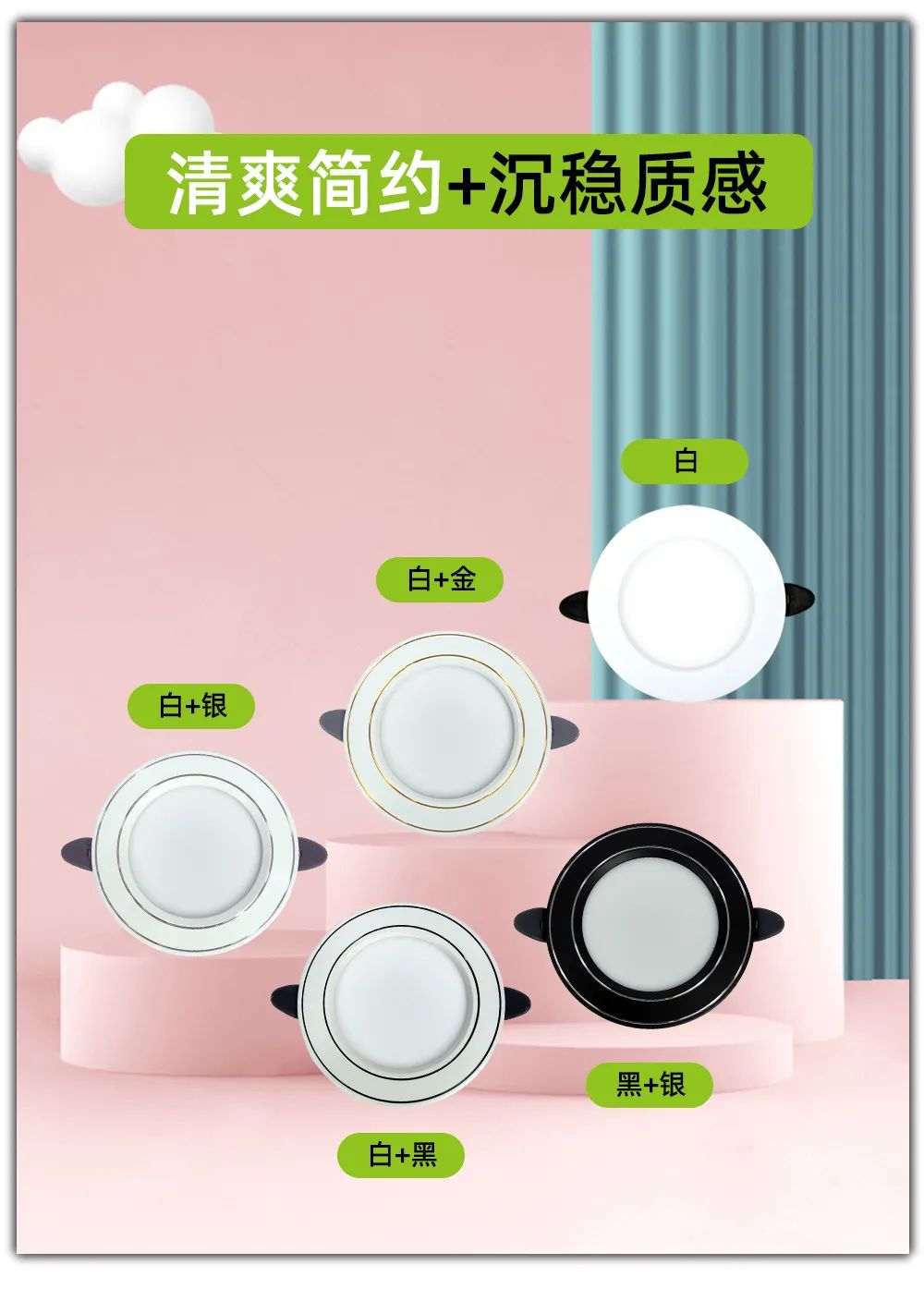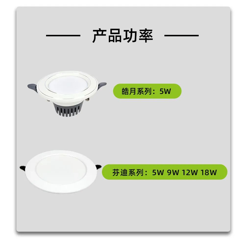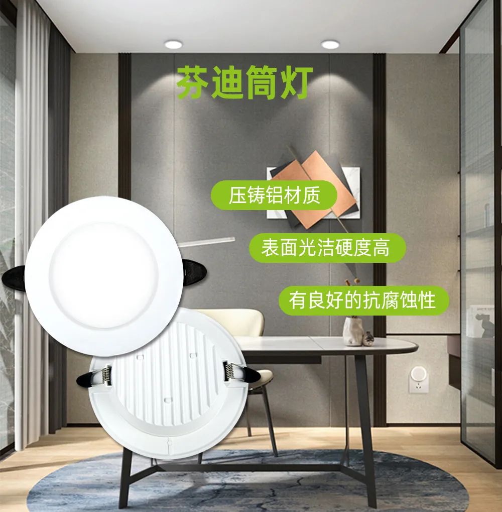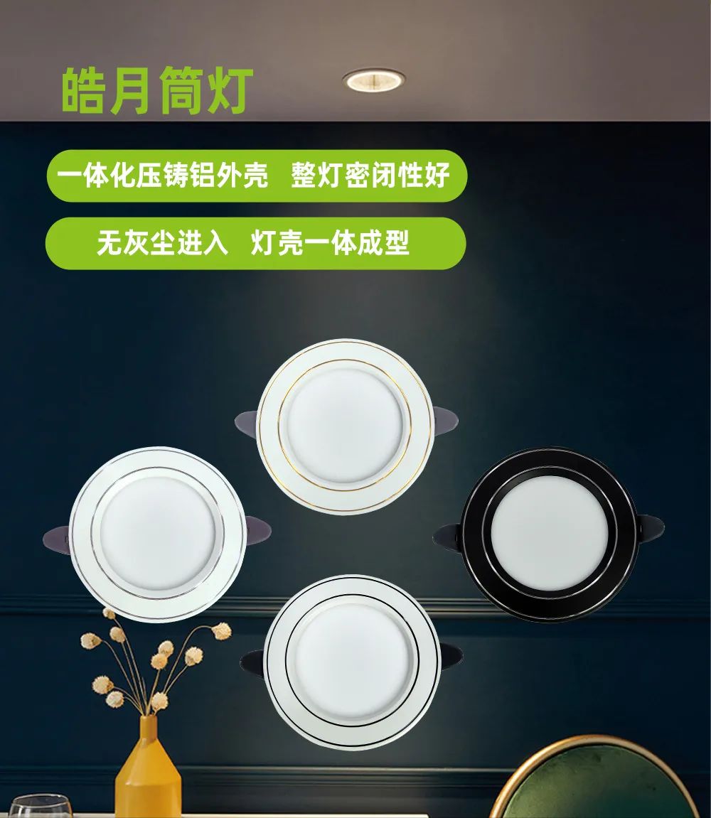 芬迪系列筒灯和皓月系列筒灯用料扎实,工艺考究,使用优质LED芯片,光线明亮柔和,大角度照射,照明面积广,满足不同场景需求。
